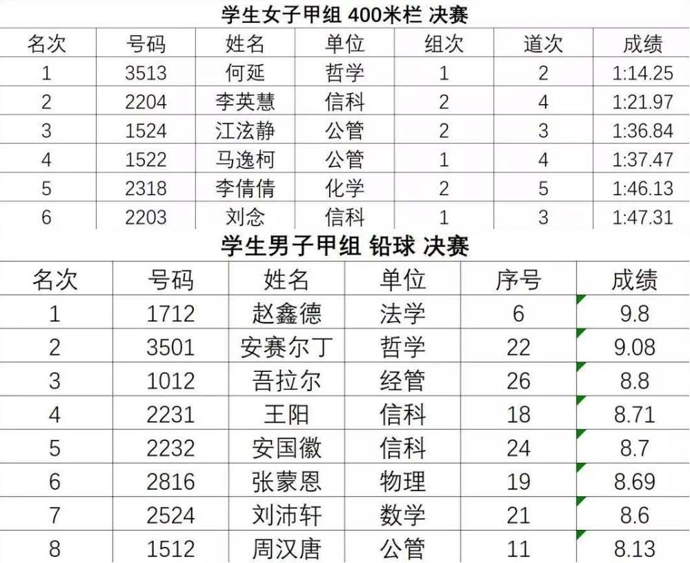 下午2:00,我院大二运动女神何延在女子甲组400米栏决赛中一路领先,高76.2厘米、10个栏对她仿佛没有任何影响,越跑越勇,憋住了心中的一口气,将对手远远地甩在后面,眼中有的是终点的红线,心中装的是我院数百学子对她的认可,终是实力超群,一举斩获女子甲组400m栏冠军,助她个人也助我院斩获本次田径运动会首枚金牌。谁说女子不如男、巾帼也不让须眉,祝贺何延,也祝贺我院。
